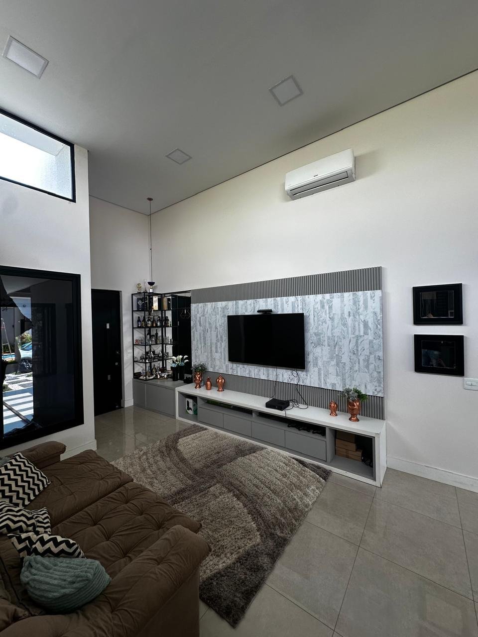 • Sala ampla com pé-direito duplo, proporcionando elegância e iluminação natural